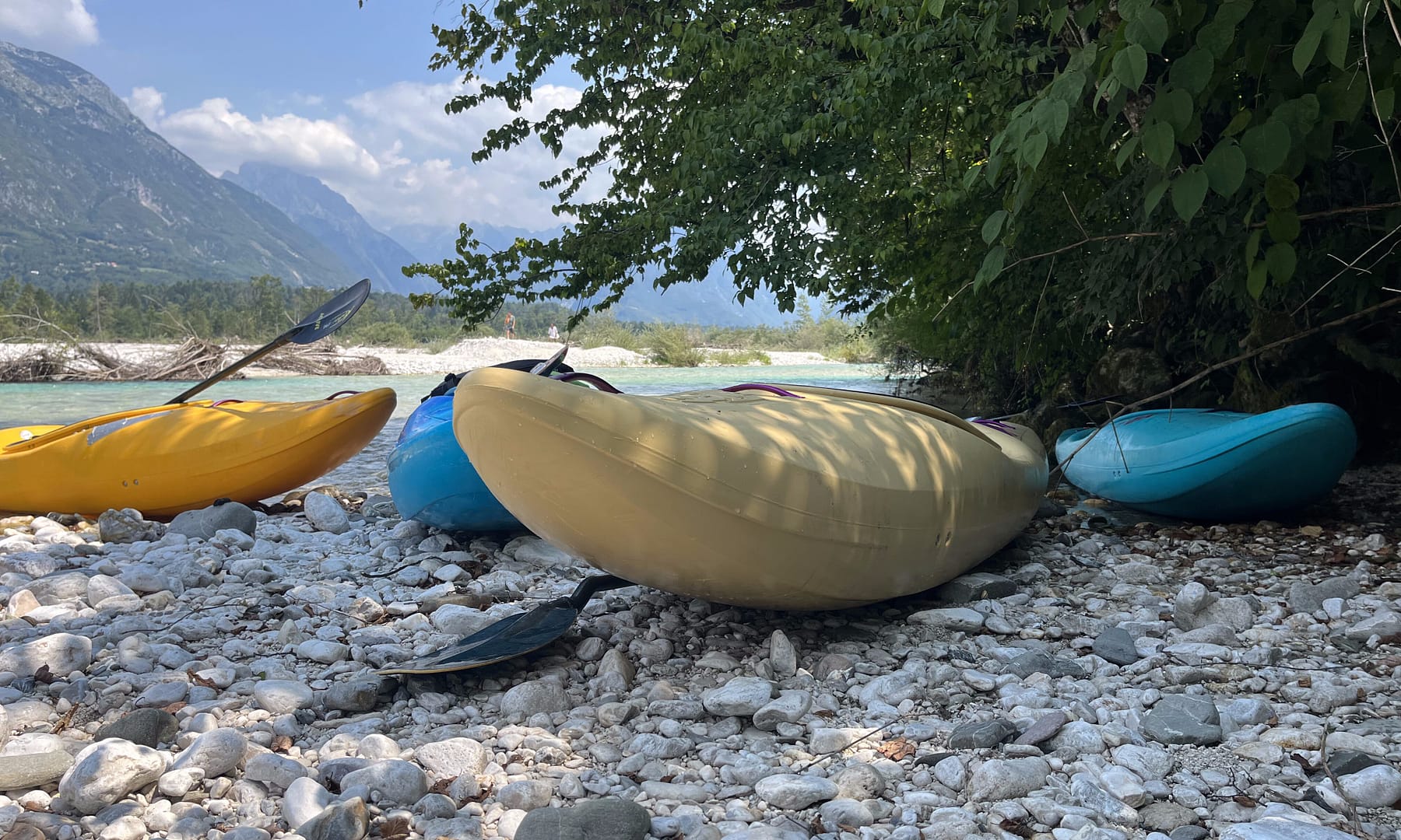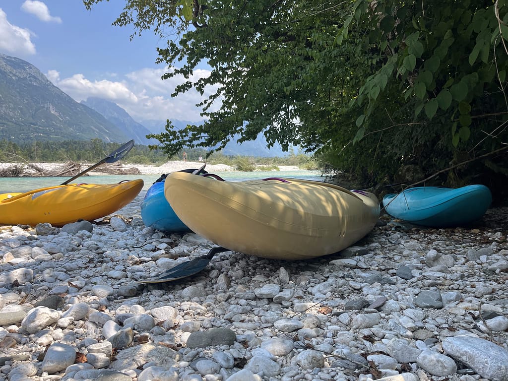 Wir hatten vier wunderschöne Tage auf diesem Campingplatz – es war wirklich ein Traum! Der Platz war sehr naturnah, umgeben von Bäumen, die uns vor der Sommersonne angenehm schützten. Zwischen den Bäumen gab es immer wieder große Wiesen, die genügend Platz für alle Zelte boten. So hatte jeder seine Privatsphäre, fühlte sich aber trotzdem nie allein. Der Weg über den Platz führte direkt hinunter zur Soča, und von hier aus starteten zahlreiche Wanderwege. Man konnte immer mal wieder eine Pause einlegen und sich ein ruhiges Plätzchen am Wasser suchen. Mein Mann hatte sich vorab einen Kajakkurs (Wildwasser) gebucht, was er sehr genoss. Der Rest der Truppe hat nach dem gemeinsamen Frühstück die Wanderwege erkundet – natürlich nicht jeden Tag. An anderen Tagen haben wir einfach mal nichts gemacht. Spiele gespielt, gebadet, Bücher gelesen oder einfach mal geschaut, wohin der Wind uns weht. Einfach mal abschalten und die Seele baumeln lassen. Das ist gar nicht so einfach, selbst für unsere Kinder ist es eine Herausforderung einfach mal gar nichts zu tun. Sich zu langweilen, muss man erst wieder lernen. Wir müssen nicht jeden Tag unterhalten werden, und das sollten auch unsere Kinder wieder lernen! Meiner Meinung nach jedenfalls.